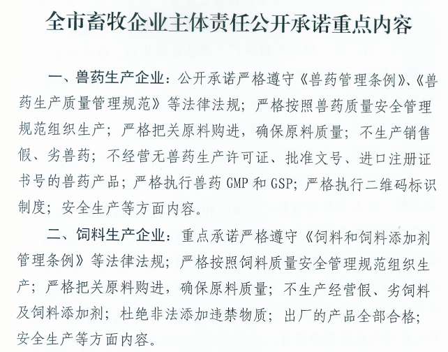 一、我們將嚴格遵守《飼料和飼料添加管理條例》等法律法規(guī)。依法生產經營,建立健全并落實產品質量安全等各項管理制度,強化行業(yè)自律,自覺接受飼料管理部門的監(jiān)督檢查。