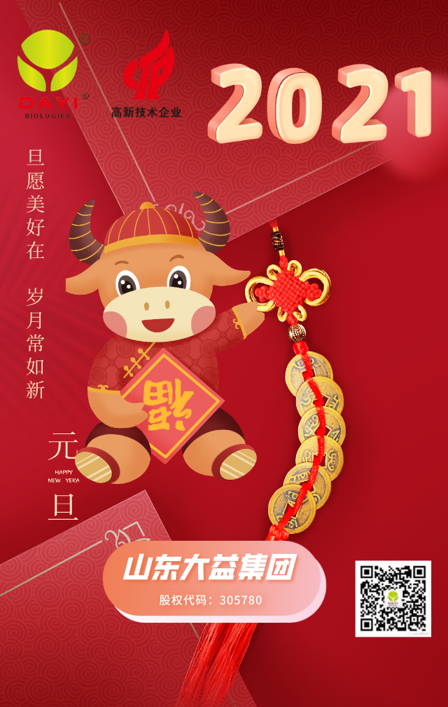 最重要的是:這一年,我們要感謝所有的新老客戶,感謝您們選擇了大益集團,是您們用信任與支持給了我們無限的發(fā)展動力,大益生物全體員工祝社會各界領(lǐng)導(dǎo),新老客戶,以及所有支持關(guān)愛公司的社會各界人士在新的2021年里牛年大吉,身體健康,闔家幸福,財源廣進。
