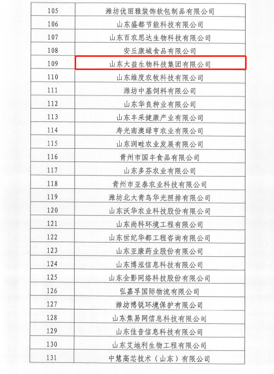 2022年11月23日,濰坊市“隱形冠軍”企業(yè)培育推進工作聯(lián)席會議辦公室發(fā)布《關(guān)于公布2022年濰坊市“隱形冠軍”企業(yè)的通知》,山東大益生物科技集團有限公司榮獲“隱形冠軍”企業(yè)的稱號。