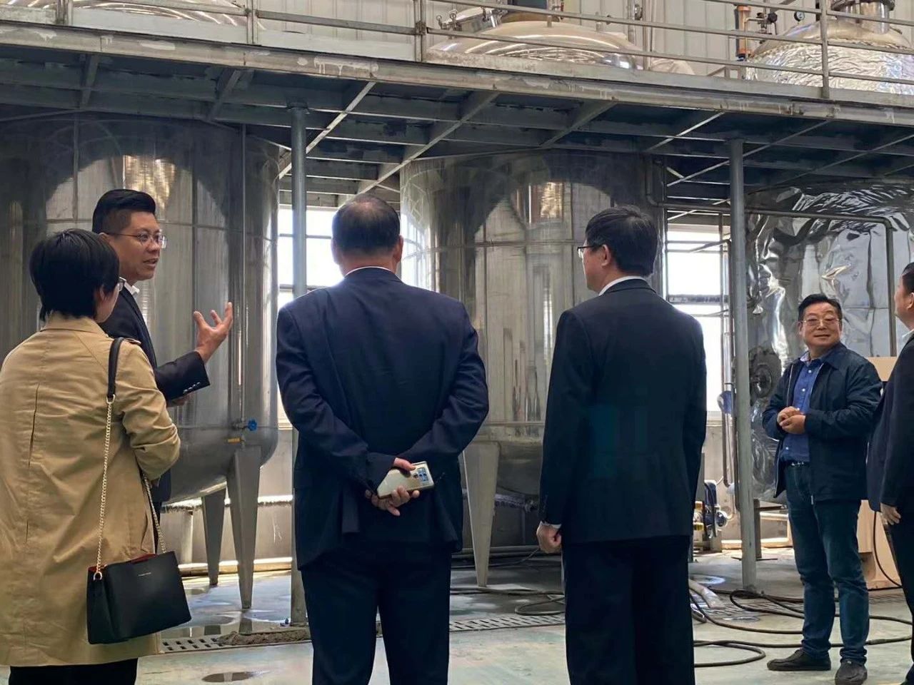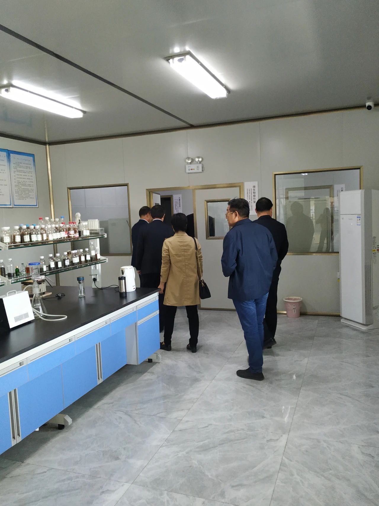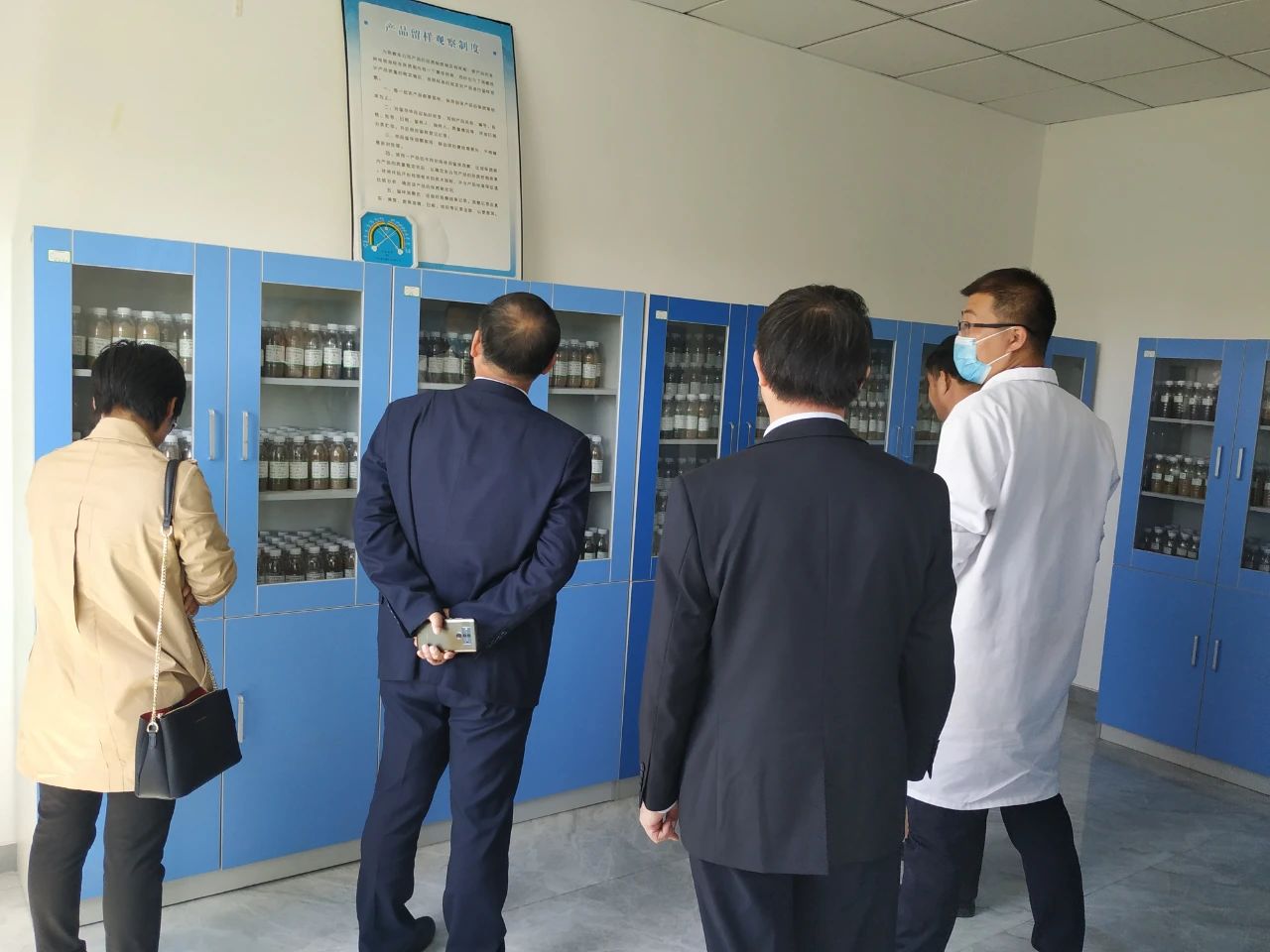 在劉總的帶領(lǐng)下,山東畜牧獸醫(yī)學(xué)院專家及領(lǐng)導(dǎo)先從生產(chǎn)車間開始考察參觀,然后是倉(cāng)庫(kù)、發(fā)酵車間、發(fā)酵罐設(shè)備、小料混合間、灌裝間、冷凍干燥間、標(biāo)準(zhǔn)化研發(fā)室、樣品留樣室等等。