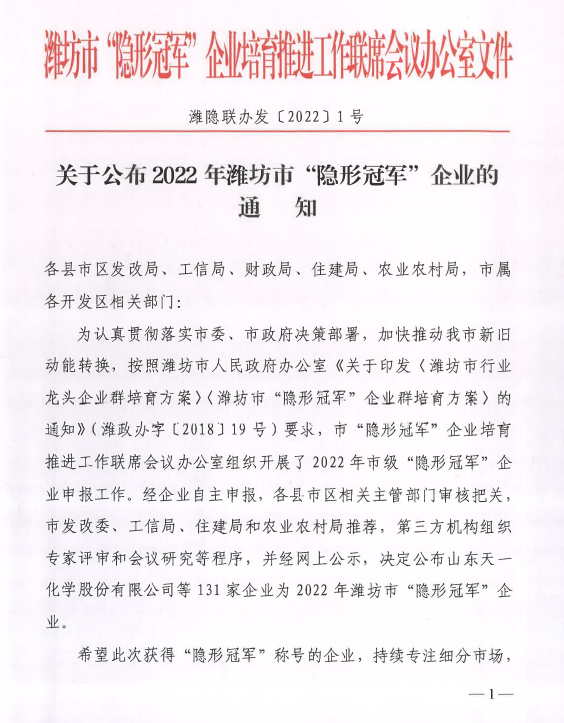 2022年11月23日,濰坊市“隱形冠軍”企業(yè)培育推進(jìn)工作聯(lián)席會(huì)議辦公室發(fā)布《關(guān)于公布2022年濰坊市“隱形冠軍”企業(yè)的通知》,山東大益生物科技集團(tuán)有限公司榮獲“隱形冠軍”企業(yè)的稱(chēng)號(hào)。